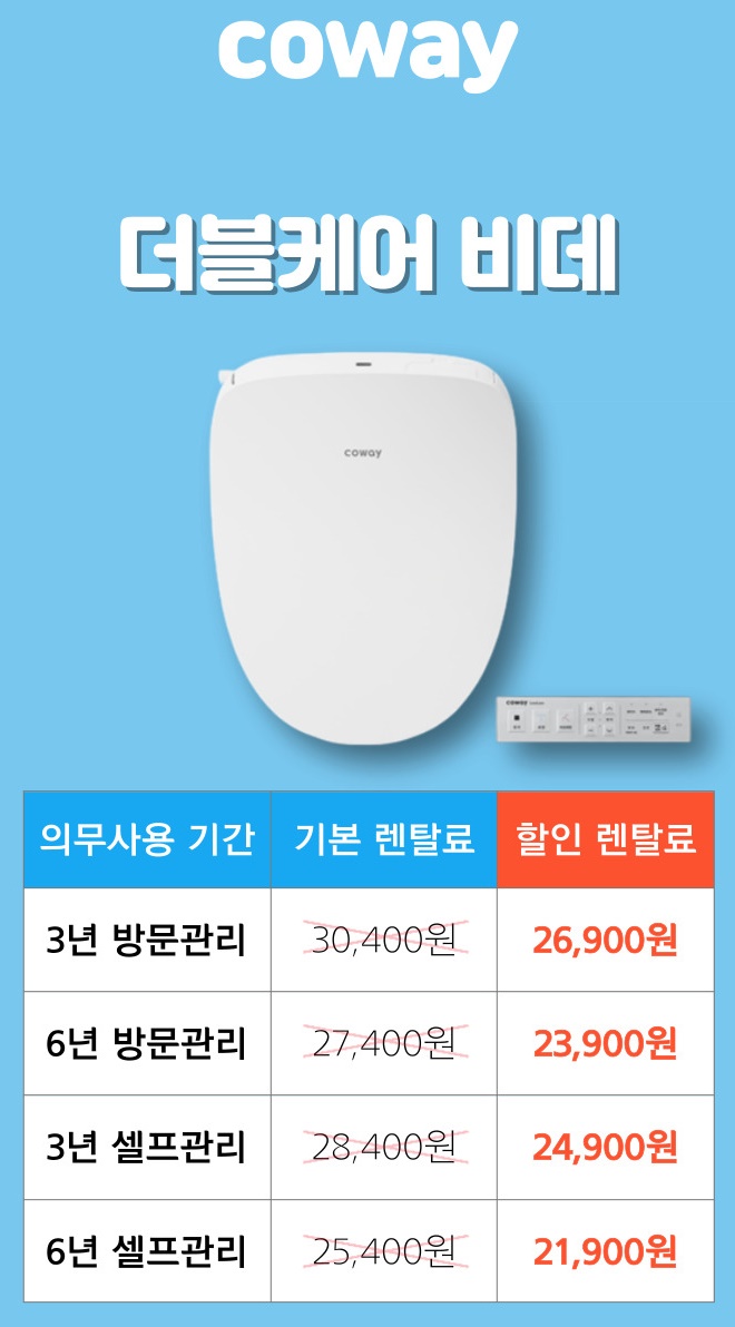 추운날씨에 모두들 안녕하신지요! 오늘은 겨울철이면 더욱 생각나는 욕실가전! 비데 제품을 소개해드리고자 야탑코웨이비데렌탈을 준비해보았어요! 오늘 이렇게 준비한 이유는 코웨이의 신제품이기 때문인데요! 비데하면 또 노래가 바로 생각나는 만큼 코웨이 비데는 우리나라에서 가장 유명하다고 할 수 있는데요! 야탑코웨이비데렌탈을 알아보고 계신분들에게 코웨이의 신제품을 소개해드리는것 뿐만 아니라 슬기로운 렌탈생활을 통해 여러분들에게 딱 맞는 비데로 만나볼 수 있어요! 다양한 혜택과 함께 하는 코웨이 신제품은 어떻게 한층 더 업그레이드 되었는지 알아보도록 하겠습니다! 코웨이의 새로운 비데 제품인 만큼 더 완벽해졌는데요! 더 위생적인 비데 사용이 될 수 있도록 강력하고 완벽한 케어를 해주는데요! 늘 깨끗한 물로 분사해주기 위해서 유로와 노즐을 전기 분새후로 오염 걱정없도록 꺠끗하게 케어해주며 더 깨끗할 수 있또록 버블로 한번더 노즐을 케어해주는데요! 이 뿐만 아니라 360도 버블 회오리 세척으로 청소하기 어려운 도기 안까지 구석구석 꼼꼼하게 더블 세척을 해주어요! 이제 비데 노블 뿐만 아니라 도기까지 세척해주니 늘 깨끗한 욕실 생활이 될 수 있겠죠? 기존 비데들은 조작부가 비데와 함께 있어섭 벽면과 도기가 좁은 부분에는 설치가 불편하여서 공간 활용도가 그렇게 높진 않았는데요! 더블케어 비데는 조작부를 리모턴으로 되어있어서 벽면에 붙여서 사용할 수 있고, 깨끗하게 관리해주는 버블 카트리지는 비데 본체 안으로 넣어서 활용도까지 높아진 비데입니다! 변좌와 커버까지 도기와 일체형처럼 사용하기 때문에 더욱 깔끔함을 보여주어요! 방수 기능으로 마음껏 물청소를 할 수 있으며 더 위생적이기 위해 노블은 처음부터 끝까지 스테인리스 노즐로 준비하였는데요! 뿐만 아니라 더 위생적인 비데 사용이 될 수 있도록 트윈 노즐로 2가지로 준비되어있어서 여성 세정용 따로, 일반 세정용 따로 사용할 수 있어요! 2가지 모두 풀 스테인리스 노블이에요! 여기다가 쉽게 분리하여 교체할 수 있는 노즐 / 건조 커버로 되어있어서 완벽한 위생으로 준비되어있어요! 이젠 비데도 스마트하게 관리가 이루어지는데요! 다른 비데와의 차원이 다름을 보여주는 똑똑한 loCare App 기능이 준비되어있습니다. 어디서든 우리집 비데 상태 확인이 가능한데요! 일별 비데 사용 시간 및 버블 케어 현황, 하트 서비스 방문 주기 등의 정보를 확인할 수 있고, 교체가 필요한 소모품에 대한 잔여량 및 최근 교체일을 확인할 수 있어요 무엇보다 스마트 고장 진단이 가능하기 때문에 제품이 조금 이상하다고 느껴지면 앱을 통해 정밀 진단하여 비데 상태를 파악하여 A/S 접수까지 쉽게 이루어집니다. 사용자가 편리하게 비데를 사용할 수 있도록 다양한 기능들이 준비되어있는데요! 내가 원할때 언제든지 비데와 도기를 청소할 수 있도록 원터치로 비데를 분리할 수 있는데요! 비데 옆면의 버튼을 누르고 당겨주기만 하면 비데가 분리되요! 또한 피부와 직접 맞닿는 변좌인 만큼 찝찝한 부분이기에 더블케어비데는 99% 항균 인증 변좌로 적용하여 세균 번식을 억제해주어 위생적으로 사용할 수 있습니다. 뿐만 아니라 무브세정, 와이드세정, 어린이 자동세정/건조, 절전모드,난방변좌까지! 빠짐없이 기능들을 꽉꽉 채워두었어요! 세정 기능도 특별한 아이웨이브 시스템으로 되어있는데요! 세정 시간부터 범위,수압까지 나의 컨디션에 맞춰 처음부터 마지막까지 섬세한 4단계 수류 코스를 이용할 수 있어요! 더블케어 비데는 셀프관리가 가능하여 관리 방법도 내게 딱 맞는 방법으로 선택할 수 있는데요! 방문관리와 셀프관리를 확인해보시고 선택해보세요! 방문관리 약정에 대해서 먼저 알아볼게요! 코웨이 비데가 오랜 기간 만족도가 높은 이유 중 하나는 코웨이코디가 정기적인 필터/부품 교체 및 깐깐한 관리서비스를 제공하기 때문인데요! 전문 관리 코디님이 고객과 약속한 시간에 방문하여 코웨이만의 서비스 도구인 파워클린 브러쉬로 관리해드리며 재사용 없이 위생적인 관리를 위해 고객별 전용서비스 키트로 관리해줍니다! 주기에 맞게 필터교체와 노블 팁, 노즐덕트,건조덕트까지 모두 교체해줘요! 셀프관리도 전혀 문제가 없는데요! 코웨이에서 믿을 수 있는 품질을 제공하는 만큼, 셀프관리가 가능한 제품인 만큼 비데 자체가 깨끗하다고 할 수 있는 부분인데요! 더블케어 기능도 있고 , 위생을 위한 완벽한 설게로 되어있어서 내가 주요 부품만 간단하게 교체하면서 사용하면 되기 때문에 요즘 셀프관리로 많이 선택해주시고 있는것 같아요! 다양한 코웨이 제휴카드들 중 나에게 딱 알맞는 카드를 통해서 매달 할인을 챙겨보실 수 있는데요! 더블케어비데같은 경우 약정을 셀프관리 6년으로 진행하면 월 렌탈료가 21,900원으로 이용할 수 있는데요! 여기다가 제휴카드 중 가장 많이 이용하는 구간인 실적 30만원에 13,000원 할인을 받는다면 월 8,900원이라는 저렴한 렌탈료로 이용할 수 있어요! 부담없는 실적으로 매달매달 할인을 꼼꼼하게 챙겨보세요! 야탑코웨이비데렌탈이 찾고 계시