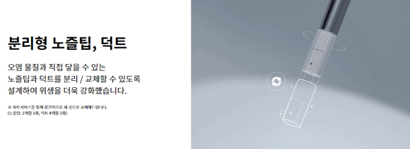 오염 물질이 닿을 수 있는 노즐팁 부분은 분리형으로 설계되어있어